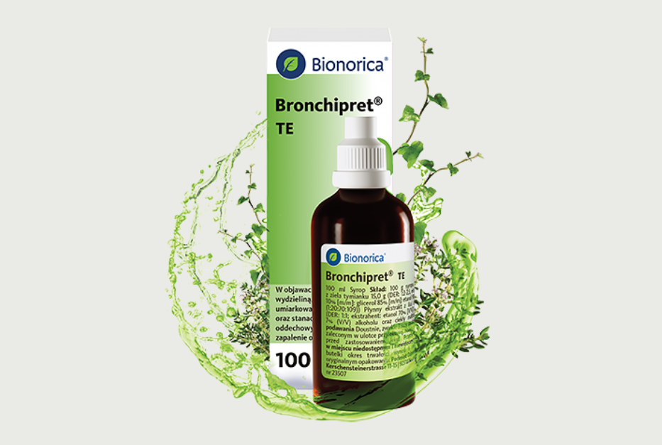 Nazwa produktu leczniczego: Bronchipret TE, syrop. Skład: 100 ml (co odpowiada 112 g) syropu zawiera:16,8 g płynnego wyciągu z Thymus vulgaris L. i(lub) Thymus zygis L., herba (tymianek) (1:2-2,5).Rozpuszczalnik ekstrakcyjny: roztwór amoniaku 10% (m/m) / glicerol (85%) (m/m) / etanol 90% (V/V) / woda oczyszczona (1/20/70/109). 1,68 g płynnego wyciągu z Hedera helix L., folium (liść bluszczu) (1:1). Rozpuszczalnik ekstrakcyjny: etanol 70% (V/V). Produkt leczniczy zawiera 7% [V/V] alkoholu. 1 ml syropu zawiera 423 mg maltitolu ciekłego, 28,76 mg sorbitolu (sorbitol zawarty w maltitolu ciekłym). Postać farmaceutyczna: Syrop. Wskazania terapeutyczne do stosowania: Produkt leczniczy roślinny stosowany w objawach kaszlu z zalegającą wydzieliną, w łagodnych do umiarkowanych infekcjach i stanach zapalnych dróg oddechowych, takich jak ostre zapalenie oskrzeli. Przeciwwskazania: Nadwrażliwość na substancje czynne oraz na inne rośliny z rodziny jasnotowatych (Lamiaceae) oraz araliowatych (Araliaceae), brzozę, bylicę pospolitą, seler, lub na którąkolwiek substancję pomocniczą. Podmiot odpowiedzialny: Bionorica SE, 92308 Neumarkt, Niemcy. Informacji o leku udziela: Bionorica Polska Sp. z o.o., ul. Hrubieszowska 6B, 01-209 Warszawa.